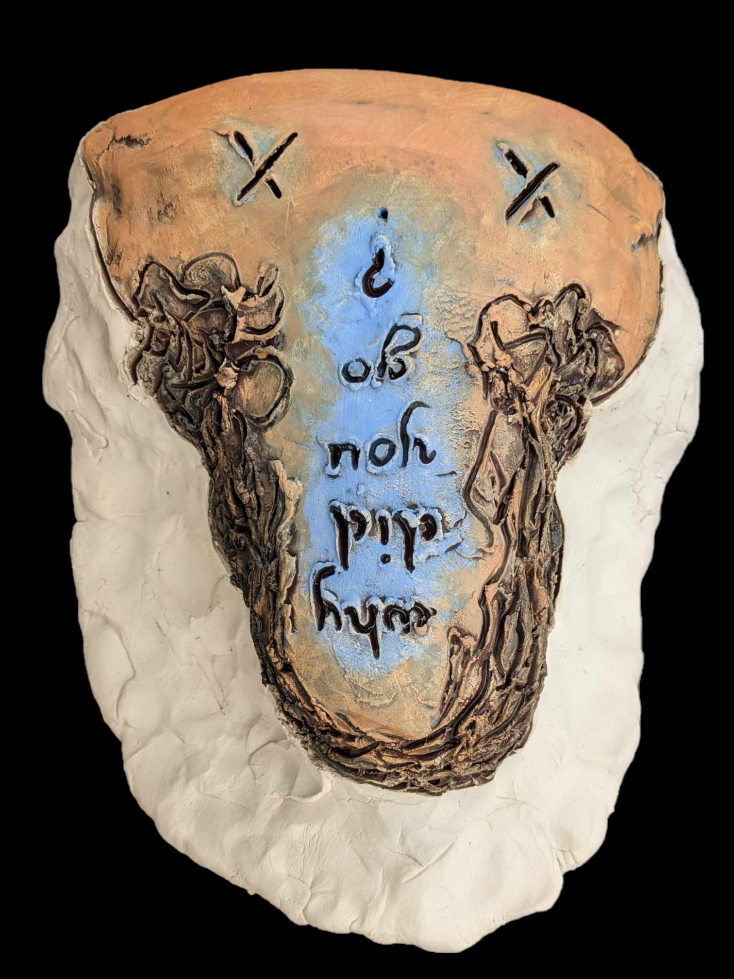 Dayna Ball, Shells, 2023 - 03 Shells are pieces of reversal, where neither side contains all the information, but rather where each side is the negative/positive of the other. In the first example, this is seen simply as the figure possessing an inside and outside. It nods back to a longer discussion of the meaning and nature of possessing breasts, in those depressions created. Furthermore, no interior anatomy is noted: a separation of the self from the body. In the next two examples, the self is isolated from environment, with environment being waves of ‘feeling’. In the fourth, the self is again isolated from environment, with hallucinations present. A particular element noteworthy here is the glow of light on the figure even though that light source is found apparent only on the back side. So here, relevancy of interaction maintains through the piece. In the final example, this negative/positive interaction is more literally witness in the boundary lines discussion of the negative/positive space interaction in terms of sexual intercourse. Where does one partner begin and the other end? Outside of these front and back notations, the negative space clay is left untreated.