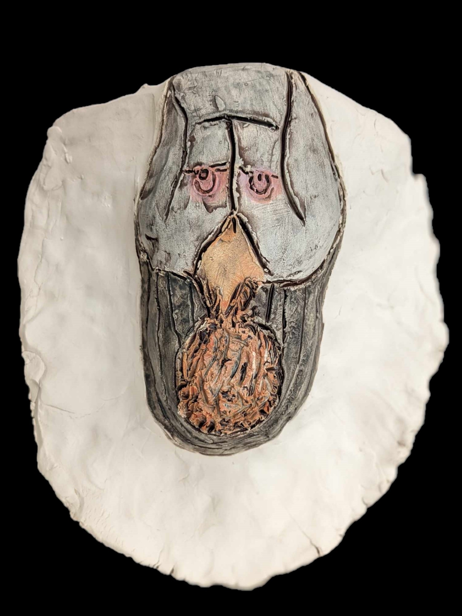 Dayna Ball, Shells, 2023 - 05 Shells are pieces of reversal, where neither side contains all the information, but rather where each side is the negative/positive of the other. In the first example, this is seen simply as the figure possessing an inside and outside. It nods back to a longer discussion of the meaning and nature of possessing breasts, in those depressions created. Furthermore, no interior anatomy is noted: a separation of the self from the body. In the next two examples, the self is isolated from environment, with environment being waves of ‘feeling’. In the fourth, the self is again isolated from environment, with hallucinations present. A particular element noteworthy here is the glow of light on the figure even though that light source is found apparent only on the back side. So here, relevancy of interaction maintains through the piece. In the final example, this negative/positive interaction is more literally witness in the boundary lines discussion of the negative/positive space interaction in terms of sexual intercourse. Where does one partner begin and the other end? Outside of these front and back notations, the negative space clay is left untreated.