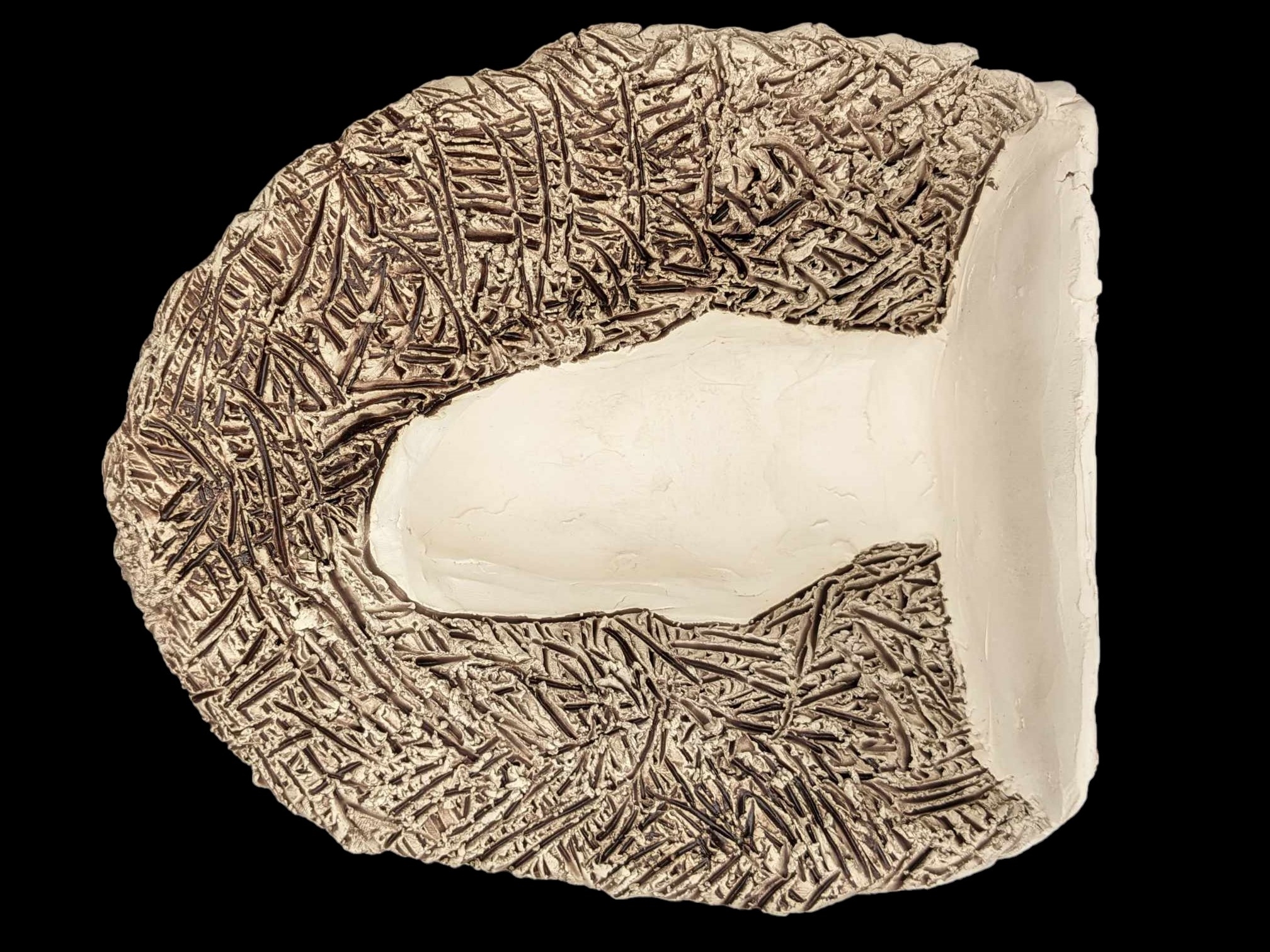 Dayna Ball, Shells, 2023 - 06 Shells are pieces of reversal, where neither side contains all the information, but rather where each side is the negative/positive of the other. In the first example, this is seen simply as the figure possessing an inside and outside. It nods back to a longer discussion of the meaning and nature of possessing breasts, in those depressions created. Furthermore, no interior anatomy is noted: a separation of the self from the body. In the next two examples, the self is isolated from environment, with environment being waves of ‘feeling’. In the fourth, the self is again isolated from environment, with hallucinations present. A particular element noteworthy here is the glow of light on the figure even though that light source is found apparent only on the back side. So here, relevancy of interaction maintains through the piece. In the final example, this negative/positive interaction is more literally witness in the boundary lines discussion of the negative/positive space interaction in terms of sexual intercourse. Where does one partner begin and the other end? Outside of these front and back notations, the negative space clay is left untreated.