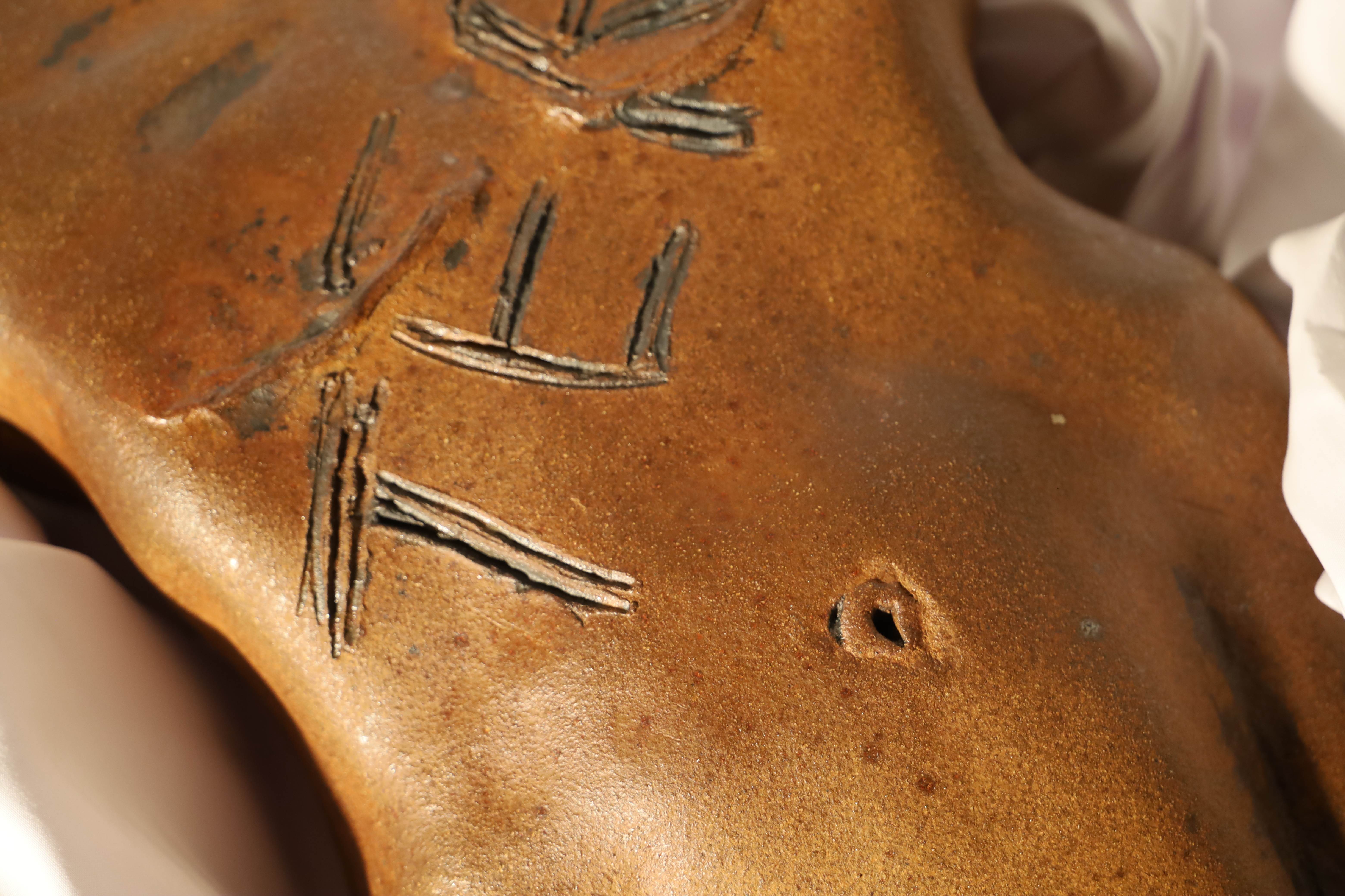 Dayna Ball, TERF, High Fire Death Valley Clay, Stains, Soda Fired, 3.5 x 11 x 15 inches, 2022 - 3 TERF discusses the challenges many women face as they have transpired through an arduous fight with breast cancer only to hear their sense of womanhood questioned on the other side by radical gender activists. Any person who agrees that gender is something you must think or feel is a person who agrees those struggling with gender identity cannot have a firm grasp on that reality. This struggle becomes attacking and a winding maze for many people who experience gender dysphoria, when even those who are supposed to help you serve only to confuse you more deeply.