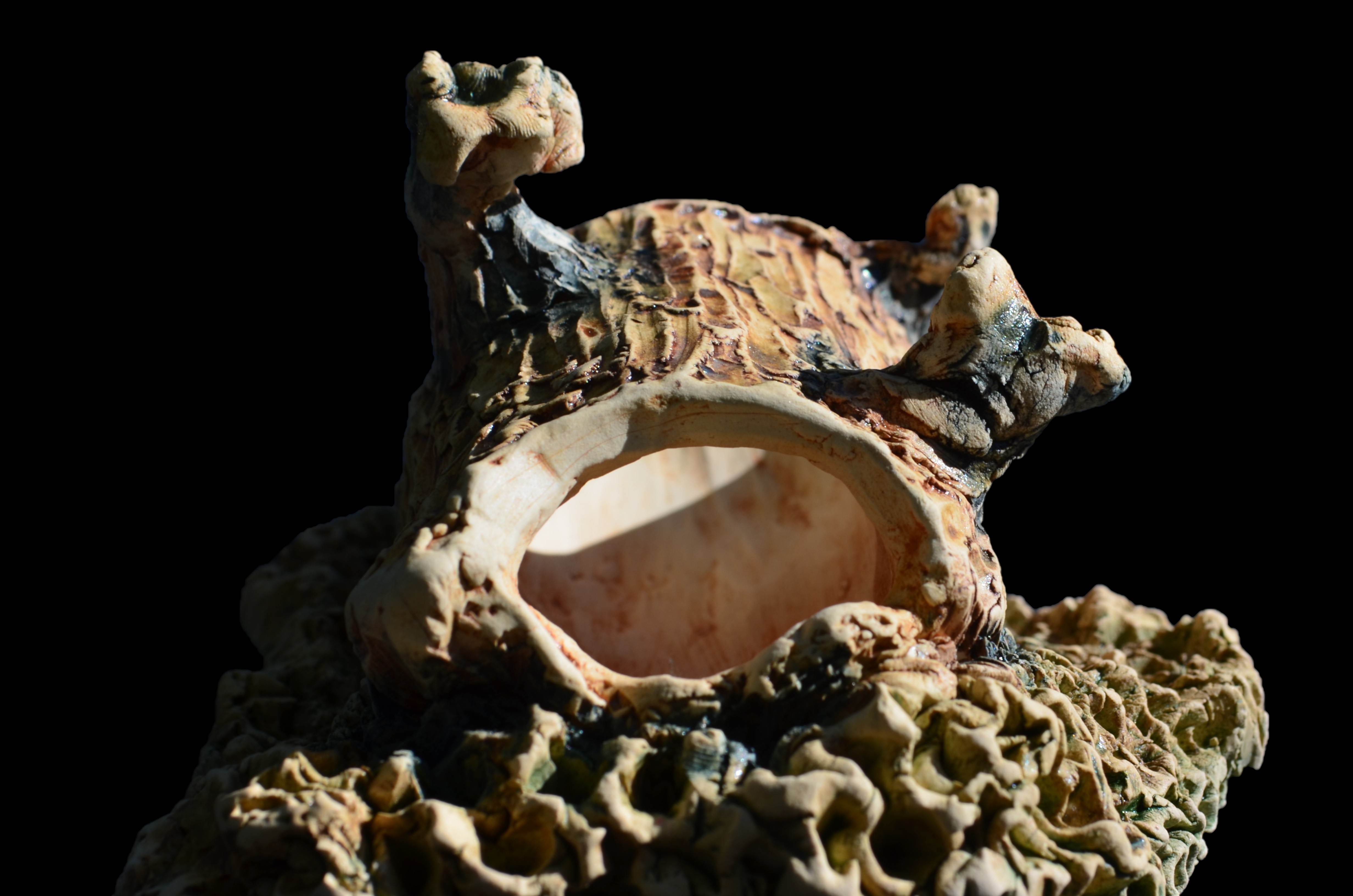 Dayna Ball, Tree Series, 2023 - 02_04 These tree series explore articulation of nature in clay. This pursuit is approached in terms of hand-built forms, meticulous incision of texture on surface, and color approach through mason stain discovery. This work seeks to explore the articulation of nature and environment as it relates to the artist, with heavy attention paid to past intellectual work in two-dimensional rendering of natural forms, with perception and idealization of nature playing a large role in that process.