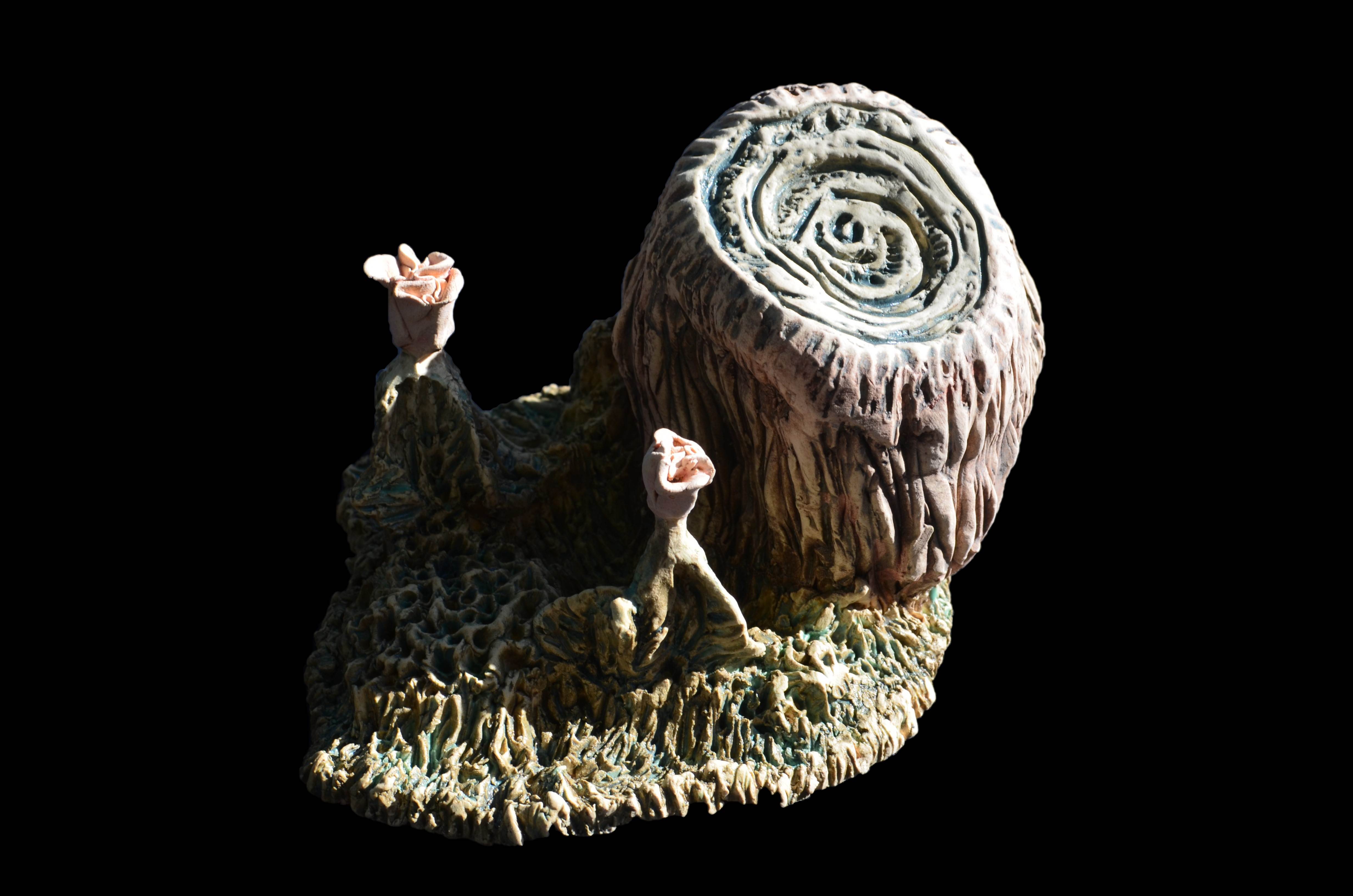 Dayna Ball, Tree Series, 2023 - 03_02 These tree series explore articulation of nature in clay. This pursuit is approached in terms of hand-built forms, meticulous incision of texture on surface, and color approach through mason stain discovery. This work seeks to explore the articulation of nature and environment as it relates to the artist, with heavy attention paid to past intellectual work in two-dimensional rendering of natural forms, with perception and idealization of nature playing a large role in that process.