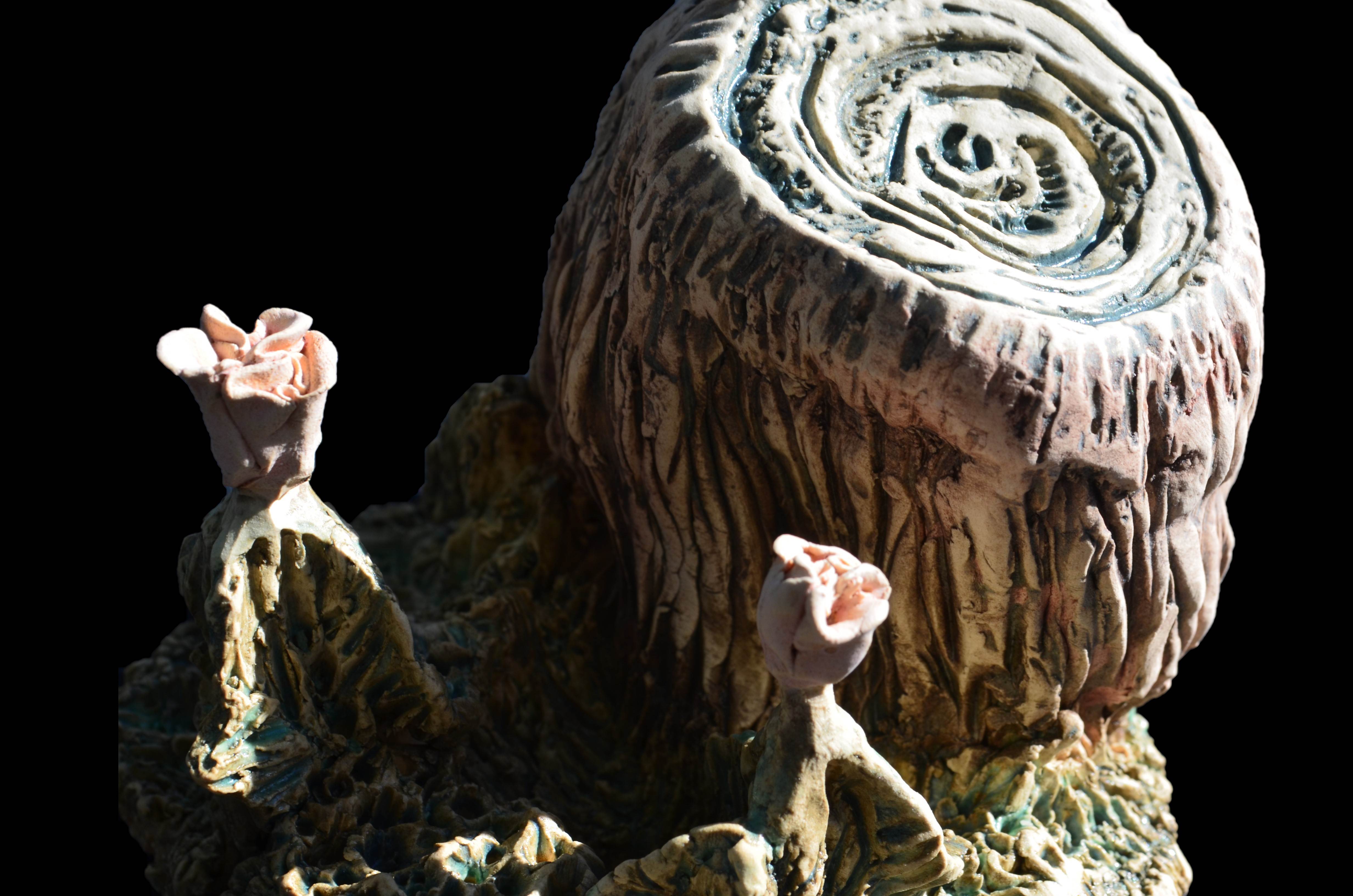 Dayna Ball, Tree Series, 2023 - 03_05 These tree series explore articulation of nature in clay. This pursuit is approached in terms of hand-built forms, meticulous incision of texture on surface, and color approach through mason stain discovery. This work seeks to explore the articulation of nature and environment as it relates to the artist, with heavy attention paid to past intellectual work in two-dimensional rendering of natural forms, with perception and idealization of nature playing a large role in that process.