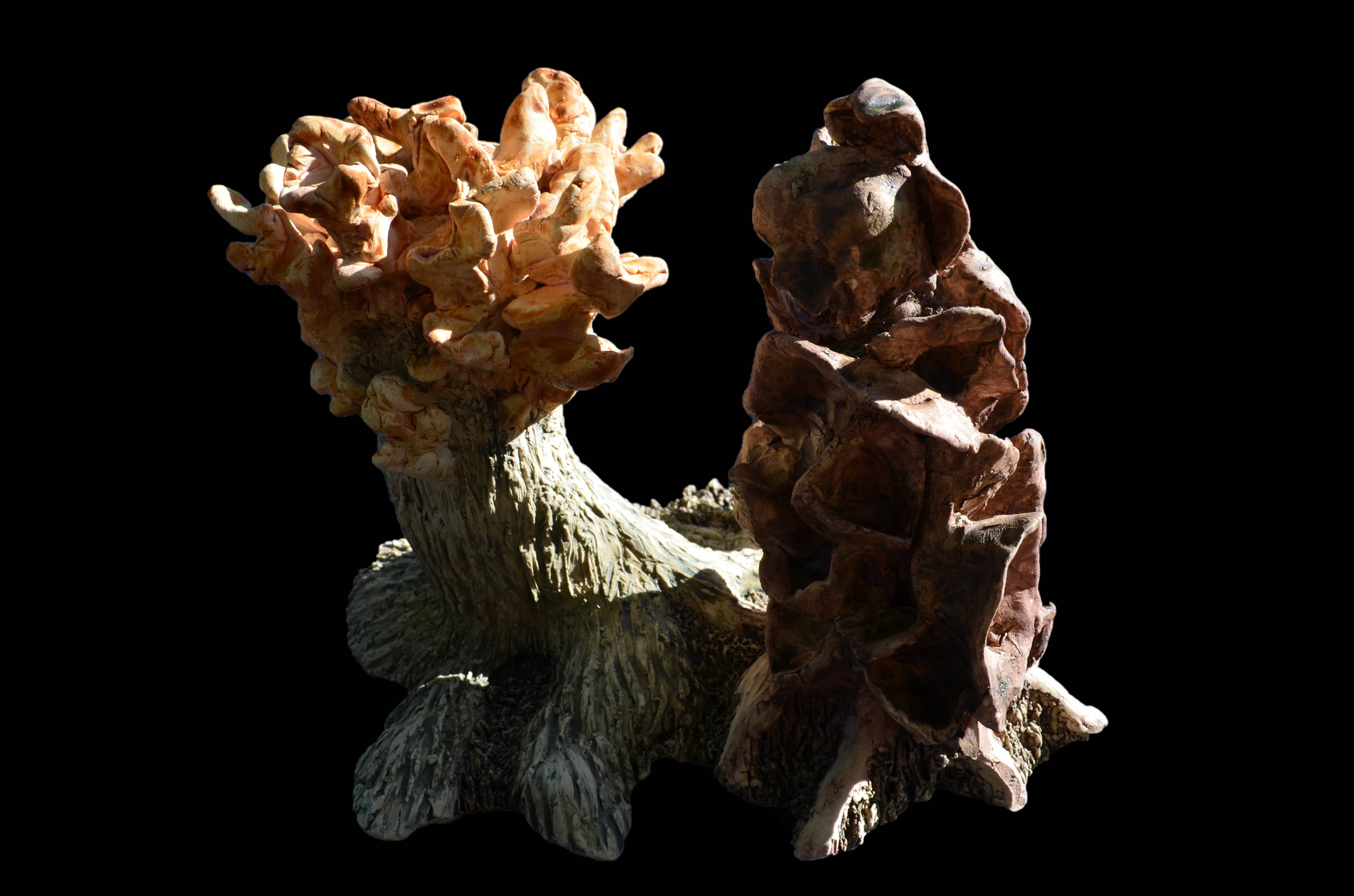 Dayna Ball, Tree Series, 2023 - 08_01 These tree series explore articulation of nature in clay. This pursuit is approached in terms of hand-built forms, meticulous incision of texture on surface, and color approach through mason stain discovery. This work seeks to explore the articulation of nature and environment as it relates to the artist, with heavy attention paid to past intellectual work in two-dimensional rendering of natural forms, with perception and idealization of nature playing a large role in that process.