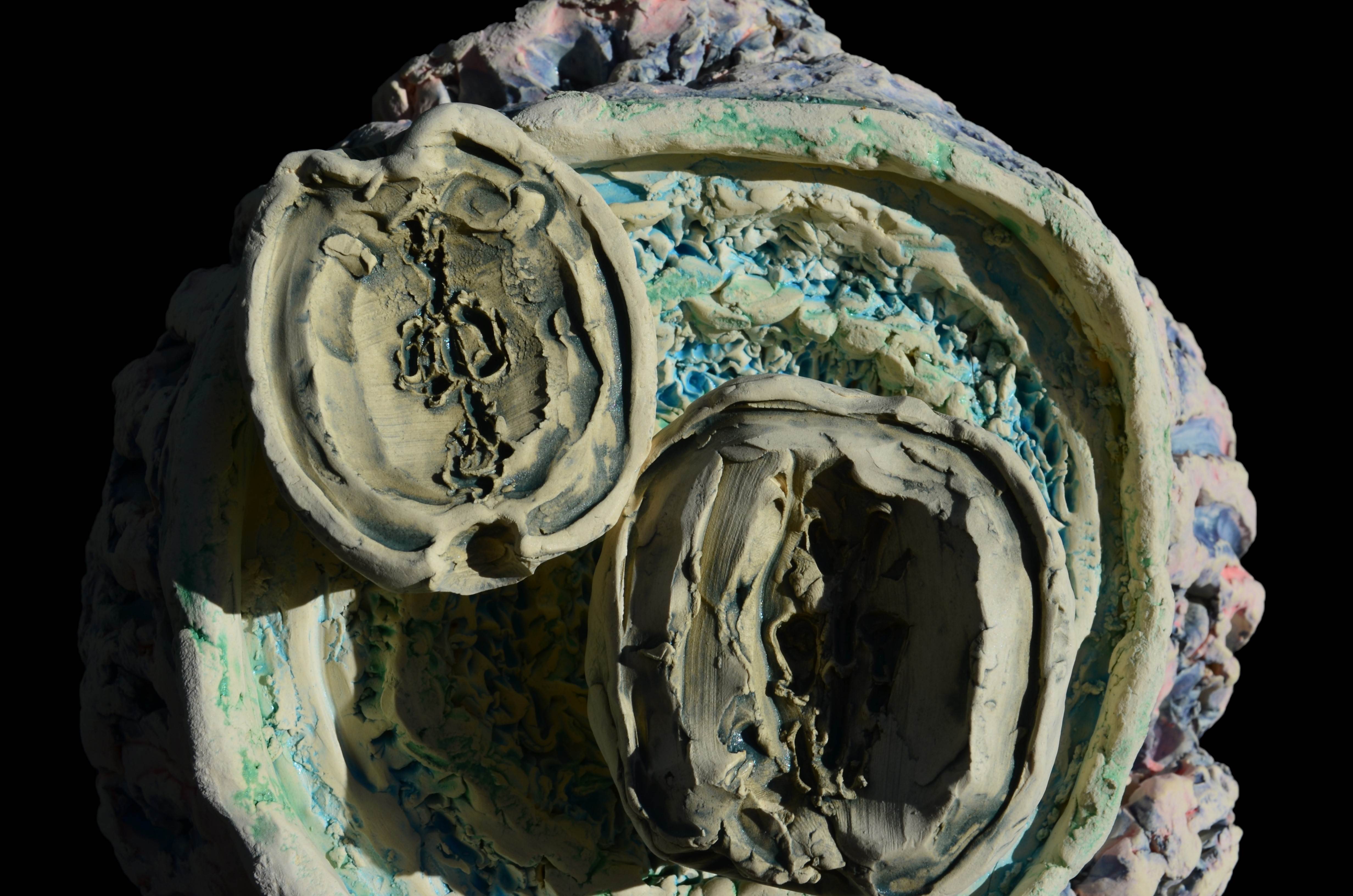 Dayna Ball, Tree Series, 2023 - 10_08 These tree series explore articulation of nature in clay. This pursuit is approached in terms of hand-built forms, meticulous incision of texture on surface, and color approach through mason stain discovery. This work seeks to explore the articulation of nature and environment as it relates to the artist, with heavy attention paid to past intellectual work in two-dimensional rendering of natural forms, with perception and idealization of nature playing a large role in that process.
